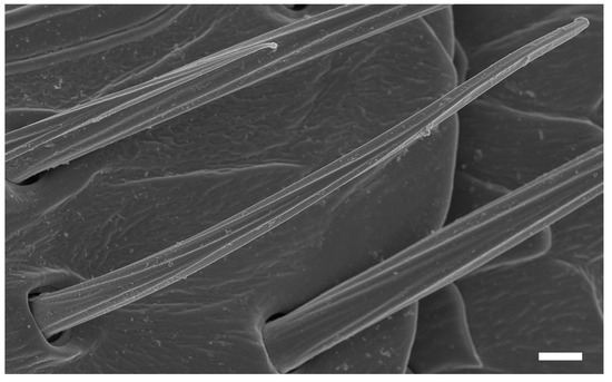 Characteristic ribbed hairs of sensilla trichodea emerging from flexible cuticular sockets. Scale bar = 2 μm.