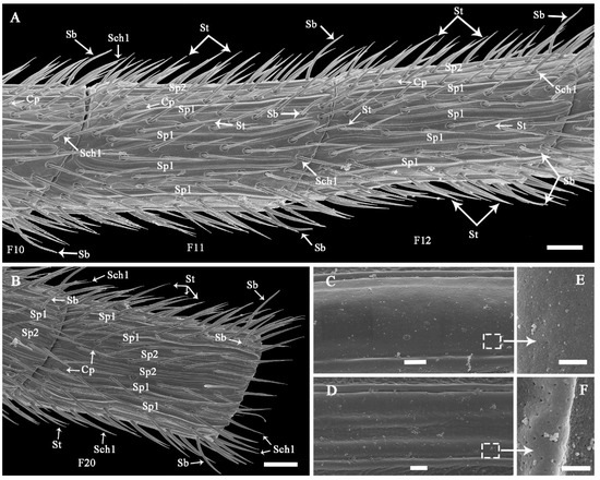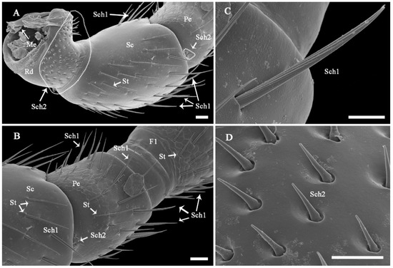 Sch are stiff, straight, ribbed (subtype 1, Sch1), or smooth (subtype 2, Sch2) bristle-like structures, but they are stronger and thicker than St (Figure 5; Table 2). Sch are aporous and arise from a cuticle with a flexible cuticular socket (Figure 6C,D). Subtype Sch1 are elongated with pointed tips. The length of Sch1 ranges from 28.6 to 45.23 μm, and the basal width ranges from 1.55 to 3.50 μm. In terms of distribution, Sch1 are usually mixed with St on all antennal segments, but they are more commonly present on the front and lateral region of every segment in both sexes (Figure 6A,B and Figure 8A,B). Subtype Sch2 are small and short bristles (7.32–15.19 μm long, 1.17–2.55 μm wide at the base) with a wide socket (1.83–4.53 basal diameter; Figure 6D). They have sharp tips. These sensilla are visible dorsolaterally on the basal part of the scape (radicula) as well as the scape–pedicel joint in both sexes (Figure 6A,B).