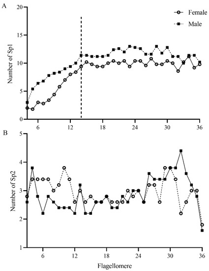 Numbers of sensilla placodea 1 (A) and 2 (B) on antennal flagellum of both sexes of C. qinlingensis (N = 5). As the dashed line shown in (A), the number of Sp1 increases gradually from flagellomere 1 to flagellomere 14 (left) but is almost the same among other flagellomeres (right).