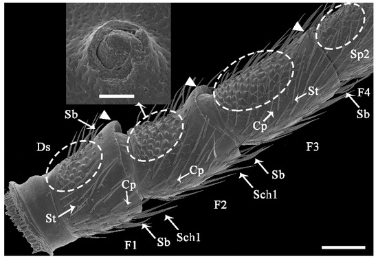 Fine morphology and distribution of antennal sensilla on the basal flagellomere of C. qinlingensis. Dotted circles show concentrated distributions of dome-shaped sensilla from a lateroventral view of flagellomeres 1–4. The inset shows thick and multi-layered cuticles perforated by surface pores. Ds, dome-shaped pores. The same acronyms and abbreviations are used in subsequent figures. Scale bar = 50 μm, Inset = 2 μm.
