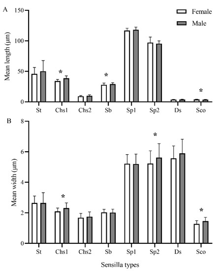 Length and width of different types of antennal sensilla in both sexes of C. qinlingensis. Data are the mean ± SD of at least 40 individual sensilla of five wasps of each sex. Asterisks (*) indicate significant differences between the two sexes (p < 0.05).