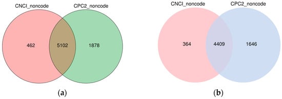 Venn Diagram of novel lncRNAs by coding capacity analysis at different time courses. (a) 36 h post-infection. (b) 72 h post-infection. CNCI indicates Coding-Non-Coding-Index and CPC2 indicates Coding Potential Calculator.