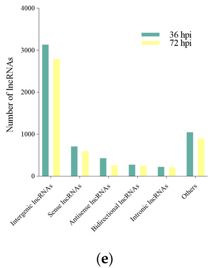 The coding capacity analysis of these transcripts predicted 5102 novel lncRNAs at 36 hpi and 4409 novel lncRNA transcripts at 72 hpi (Figure 1).