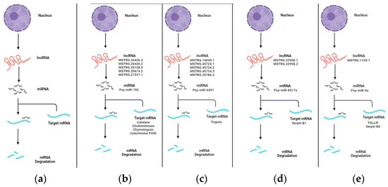LncRNA-miRNA-mRNA complex. The lncRNA acts as a miRNA precursor, which may participate in mRNA degradation. Key immunity and developmental-related complex are presented here. (a) The proposed model of lncRNA acting as miRNA precursor. (b) Multiple lncRNAs as the precursor of pxy-miR-750, which can regulate the expression of multiple mRNAs such as catalase, cholinesterase, chymotrypsin and cytochrome p450. (c) Multiple lncRNAs as the precursor of pxy-miR-6497 whose target site was identified in trypsin. (d) LncRNAs MSTRG.33958.1/2 as precursors of pxy-8517a which can target serpin B1; and (e) LncRNA MSTRG.1159.1 as a potential precursor of pxy-miR-9a whose target sites were identified in tollip and serpin B6.