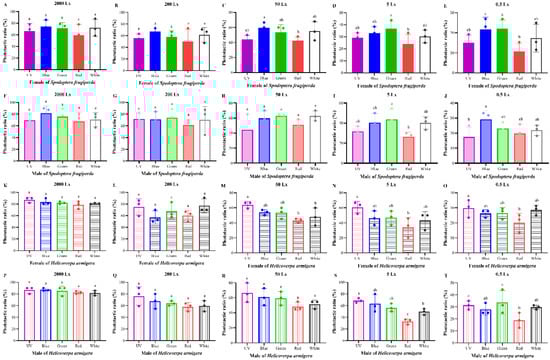 In addition, there were no obvious differences in the phototactic rates between the sexes of the two moths to the same light source and light intensity, though the phototactic rates of males were slightly higher than those of females (Figure 2); therefore, the phototactic rates of male and female moths were combined and were not compared separately later.