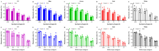 Phototactic rates of male and female adults of S. frugiperda and H. armigera. (A–E), phototactic ratios of male and female adults of S. frugiperda to different wavelength lights under five light intensities ((A) for UV light; (B) for blue light; (C) for green light; (D) for red light; (E) for white light). (F–J), phototactic ratios of male and female adults of H. armigera to different wavelength lights under five light intensities ((F) for UV light; (G) for blue light; (H) for green light; (I) for red light; (J) for white light). Data are mean ± SE. Means between the two groups under the same light intensity were compared according to Student’s t-test (p < 0.05). UV, UV LED; Blue, blue LED; Green, green LED; Red, red LED; White, white LED.
