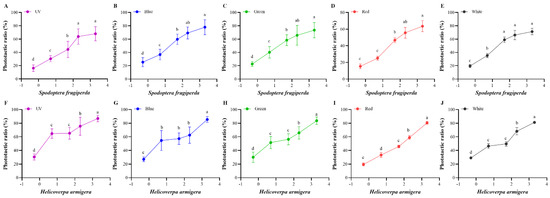 Phototactic rates of S. frugiperda and H. armigera to different intensities. (A–E), phototactic ratios of S. frugiperda to different wavelength lights under five light intensities ((A) for UV light; (B) for blue light; (C) for green light; (D) for red light; (E) for white light). (F–J), phototactic ratios of H. armigera to different wavelength lights under five light intensities ((F) for UV light; (G) for blue light; (H) for green light; (I) for red light; (J) for white light). The light intensity is 0.5, 5, 50, 200, and 2000 lx, and is transformed into log10 values. Data are mean ± SE. Means with different letters are significantly different according to Dunnett’s test (p < 0.05, ANOVA). UV, UV LED; Blue, blue LED; Green, green LED; Red, red LED; Black, white LED.