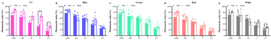 For females of S. frugiperda, there were no significant differences between the five light sources at high light intensity (2000 and 200 lx). When the light intensity was at the medium light intensity of 50 lx, the attraction rate of blue light was observably higher than that of red light (p < 0.05). Nevertheless, the phototactic rate of females to green light was remarkably higher than that of red light when at a low light intensity of 5 lx (p < 0.05). Additionally, male moths had a higher phototactic rate to green light than that of red light at 5 lx and a significant difference in the phototactic rate was recorded between blue and UV light (p < 0.05).