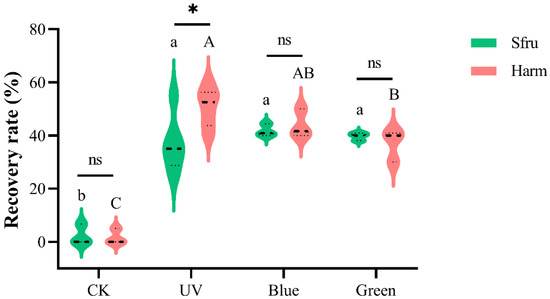 Phototactic recovery rates of S. frugiperda and H. armigera under indoor simulated conditions. The light intensity is 0.5 lx for three LED lights. Data are mean ± SE. Different letters of the same species indicate significant differences among different treatments (p < 0.05, ANOVA). “*” indicates a significant difference between the two samples (p < 0.05, t-test), while “ns” means not.