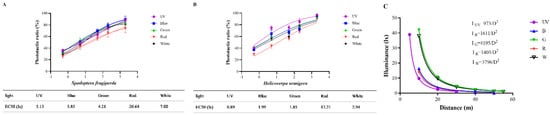 EC50 of S. frugiperda and H. armigera to different wavelength light sources. The fitting equation was obtained using the software of GraphPad Prism version: 9.3.0, and light intensities were converted by log. EC50 and was calculated by nonlinear regression curve fit and log (agonist) vs. normalized response−variable slope. (A) for S. frugiperda. (B) for H. armigera. (C) Light intensities of five light sources at different distances were measured and the relationship functions between light intensity and distance of each light source were calculated.