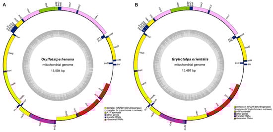 Mitochondrial genome arrangements. (A) Mitochondrial genome of Gryllotalpa henana. (B) Mitochondrial genome of Gryllotalpa orientalis. The J-strand is visualized on the outer circle and the N-strand on the inner circle. The dark and light areas of the grey inner circle represent the GC- and AT-content, respectively.