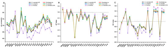 The tRNAs of G. henana possess a total of 36 unmatched base pairs, including 31 GU mismatches in most tRNAs, three AC mismatches in the anticodon stem of trnS1 and trnW and the TψC stem of trnN, and two UU mismatches in the acceptor stem of trnD and the anticodon stem of trnA (Figure 4, Supplementary Table S4). A total of 30 mismatches were detected in the Chinese G. orientalis. Twenty-seven of them are GU pairs, two are UU mismatches in the DHU stem of trnC and the acceptor stem of trnL1, and one is AA pair in the anticodon arm of trnS1. The mismatch number in the Chinese G. orientalis is lower than that in the Korean one (36 mismatches) (Supplementary Table S4), suggesting that the mitogenomes are differentiated intraspecifically.