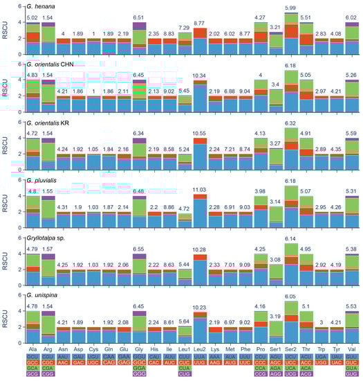 Relative synonymous codon usage (RSCU) of the mitochondrial genomes of six species in Gryllotalpidae. CHN, China; KR, Korea. The numbers above the colored columns indicate the frequencies of amino acids.