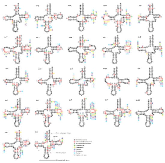 The 22 tRNAs of the two new mitogenomes are scattered around the circular DNA molecule, and are arranged identically in order and direction (Figure 1). The tRNAs of gryllotalpids retain the ancestral gene order [10,11,12,13], whereas multiple patterns of tRNA rearrangements have been detected in many other ensiferans [39,48] and most caeliferans [35]. All tRNAs exhibit typical clover–leaf structure, except for trnS1 (Figure 4). The dihydrouridine (DHU) arm of trnS1 forms a simple loop as in many other metazoans including gryllotalpids [10,11,12,13,52,56]. The length of tRNAs varies from 62 bp (trnC) to 71 bp (trnK) in G. henana and from 61 bp (trnC) to 71 bp (trnK) in the Chinese G. orientalis (Table 2), both within the variation range in Gryllotalpidae. The trnG gene of gryllotalpids generally exhibits the lowest nucleotide substitutions, while trnL1, trnW and trnY genes tend to be more variable among 22 tRNA genes (Figure 4). All tRNAs in the mitogenomes of Gryllotalpidae possess invariable length of 7 bp for both the acceptor stem and the anticodon loop. The length of anticodon stem is relatively conservative, varying from 4 bp in trnK and trnM to 5 bp in the rest of tRNAs. Most of the size variations among tRNAs stemmed from the length variation in DHU and TψC arms, within which the size of loops (all 3–10 bp) is more variable than that of stems (all 3–5 bp).