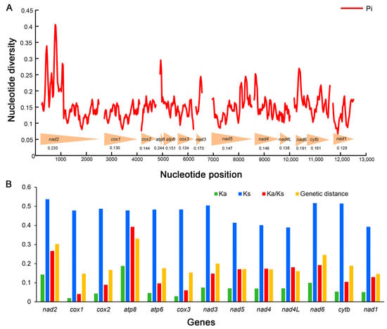 Genetic diversity and selection pressure among 13 protein-coding genes (PCGs) in Gryllotalpidae. (A) Sliding window analyses with a window of 100 bp and a step size of 25 bp for 13 PCGs. The red curve shows the values of nucleotide diversity (Pi). The arrowheads at the bottom illustrates the position of each PCG. The Pi value of each PCG is shown below the arrowheads. (B) Genetic distance and Ka/Ks ratio of each PCG in Gryllotalpidae. Ka, non-synonymous substitution rates; Ks, synonymous substitution rates.
