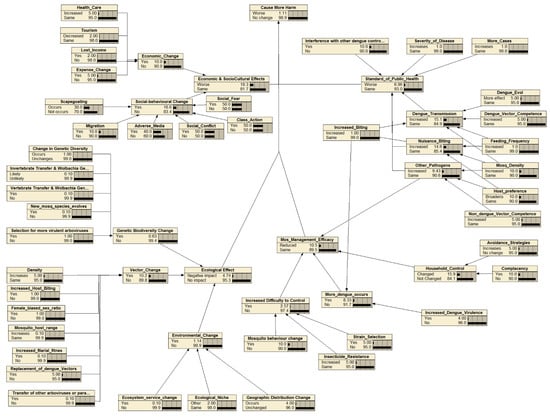 The Bayesian belief network for the endpoint “cause more harm”. Each node (box) represents probability of hazards that might occur within the next 30 years as the result of the release of Wolbachia-infected Ae. aegypti.