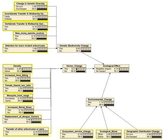 The Bayesian belief network for the endpoint “ecological effects”. Each node (box) represents probability of hazards that might occur within the next 30 years as the result of the release of Wolbachia-infected Ae. aegypti. Parent nodes are in the yellow boxes.