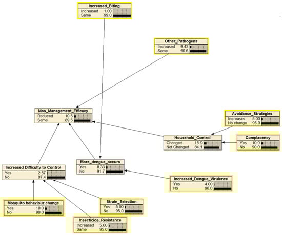The Bayesian belief network for the endpoint “mosquito management efficacy”. Each node (box) represents the probability of hazards that might occur within the next 30 years as the result of the release of Wolbachia-infected Ae. aegypti. Parent nodes are in the yellow boxes.