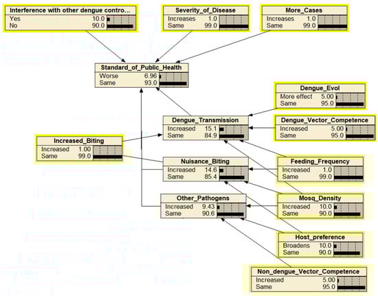 The Bayesian belief network for the endpoint “standard of public health”. Each node (box) represents the probability of hazards that might occur within the next 30 years as the result of the release of Wolbachia-infected Ae. aegypti. Parent nodes are in the yellow boxes.