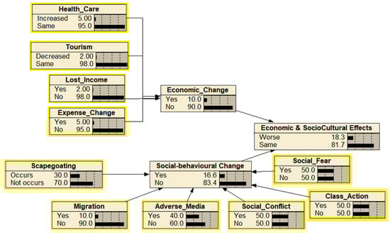 The Bayesian belief network for the endpoint “economic and socio-cultural effects”. Each node (box) represents the probability of hazards that might occur within the next 30 years as results of the release of Wolbachia-infected Ae. aegypti. Parent nodes are in the yellow boxes.