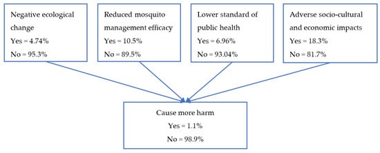 The next step of BBN in this risk assessment was discussions about the hazard likelihood of the four main components of cause more harm. The estimation yielded negligible likelihood of 1.11% (Figure 7). The likelihoods of hazards from the four components were 4.74% for ecological effects and 6.96% for the standards of public health, indicating negligible likelihood, and mosquito management efficacy and economic and sociocultural effects had likelihoods of 10.5% and 18.3%, which demonstrates a very low likelihood of risk from the hazards if Wolbachia-infected Ae. aegypti are released to suppress DENV.