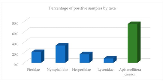 The results of the data analysis of butterfly taxa showed that the family Nymphalidae reported the highest percentage of positive results (33.3%), followed by Pieridae (20.8%), Hesperiidae (16.6%), and Lycenidae (8.3%). For bees, 75% of the samples were positive (Figure 1).