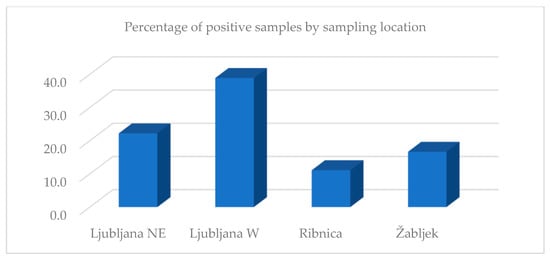 The analysis by sampling location showed that Ljubljana W had the highest percentage of positive results (38.9%), followed by Ljubljana NE (22.2%), Žabljek (16.7%), and Ribnica (11.1%). The bee samples by location were not analyzed because only one bee sample was obtained from each location (Figure 2).