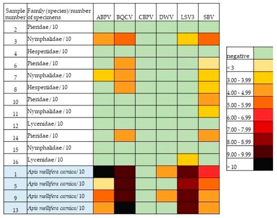 Viral RNA copy number in each tested sample, which consisted of 10 butterflies/10 honeybees for each virus individually.