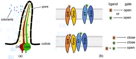 - Sato, K.; Pellegrino, M.; Nakagawa, T.; Nakagawa, T.; Vosshall, L.B.; Touhara, K. Insect olfactory receptors are heteromeric ligand-gated ion channels. Nature 2008, 452, 1002–1006. [Google Scholar] [CrossRef]