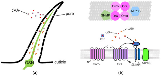 Model of cVA detection mechanism in aT1 neurons. (a) Cartoon of aT1 trichoid sensillum. aT1 sensilla have numerous pores in the cuticle layer and house a single olfactory receptor neuron (OSN) dendrite. LUSH (cup-shaped structures in sensillum lymph) binds cVA and deliver it to neuronal receptors. (b) Receptor complex in aT1 sensillum. In this sensillum, tetrameric receptor complex is composed of Or67d pheromone receptor, the coreceptor Orco. SNMP1, a CD36-related sensory neuron membrane protein, is also required in dendritic membrane. ATP8B, a lipid flippase, is also important for normal Orco-dependent responses [63,64].