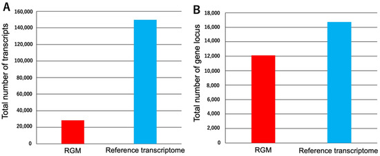 Comparisons of the total numbers of transcripts and gene loci in the reference gene model (RGM) and the reference transcriptome data. (A) Comparisons of the total number of transcripts and both datasets. (B) Comparisons of the total numbers of gene loci in both datasets via the gffcompare program.