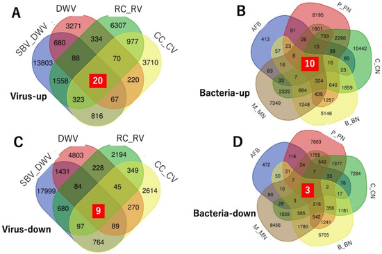 Transcripts upregulated or downregulated in response to viral or bacterial infection. Numbers in Venn diagrams indicate numbers of upregulated transcripts in experiments (Table 1) on viral infection (A) or bacterial infection (B) and numbers of downregulated transcripts in experiments on viral infection (C) or bacterial infection (D). White numbers in red squares indicate numbers of upregulated or downregulated transcripts in all experiments in (A–D).