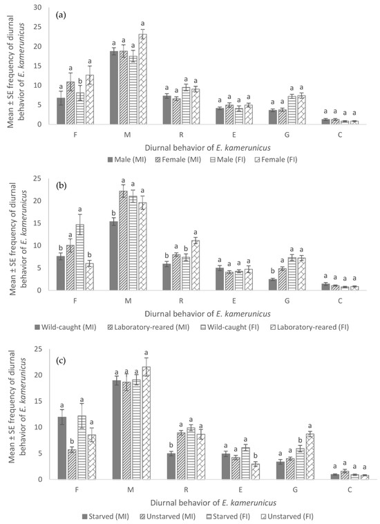 Mean (± SE) frequency of diurnal behavior of E. kamerunicus between (a) sexes (b) sources of E. kamerunicus and (c) levels of starvation on oil palm male inflorescence (MI) and female inflorescence (FI); F = flying, M = moving, R = resting, E = eating, G = grooming, C = mating/copulate. Note: same case letters indicate that there is no significant difference (p < 0.05).