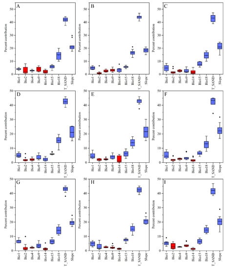The predicted percent contribution of environmental variables after 10 replication runs based on different climate scenarios was assessed. The variables T-SAND, slope, bio18, bio15, bio9, and bio1 contributed relatively significantly to the model (Figure 2A–I).; therefore, these variables had the greatest impact on the predictions of the MaxEnt model. Of these variables, T-SAND, slope, bio18, and bio15 had a total contribution to the model of more than 80% (Figure 2A–I).