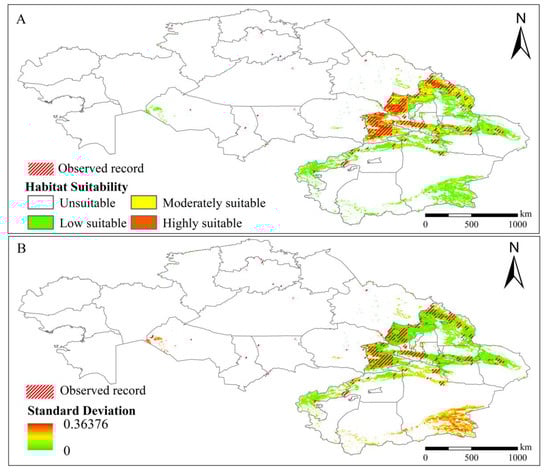The standard deviations across model runs were modest, indicating that the model is resilient. The largest standard deviations were for the A-erh-chin Mountains and Aral Sea regions, indicating that the estimated possible habitat ranges in those areas were inaccurate (Figure 3B). The model classified areas with uncertainty as having low or moderate suitability, although no locust occurrences were recorded in those areas (Figure 3A).