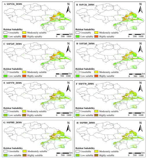 The MaxEnt model predicted the potential distribution of locusts in the 2030s and 2050s. Compared to the current situation, the predicted potential habitat ranges, assuming different scenarios for the two periods, were generally consistent in spatial distribution (Figure 4A–H).