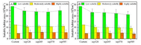 Area of typical locust suitable habitat assuming different scenarios. (A) 2030s, (B) 2050s. The error bars represent the standard deviation between the results of the 20 GCM models.
