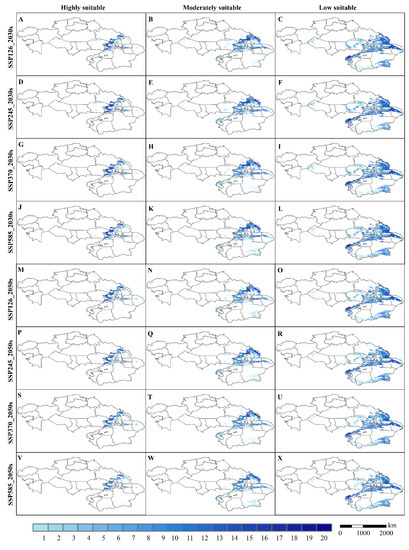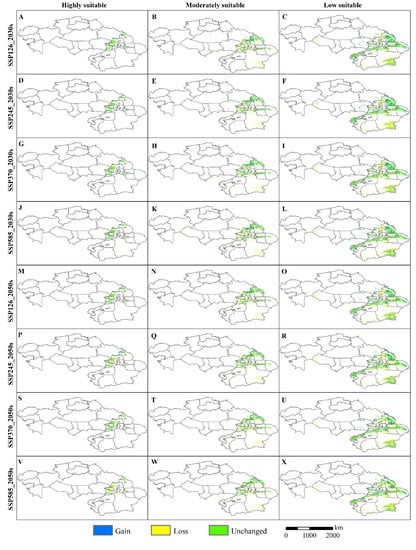 Specifically, in all periods, the potentially suitable habitat areas showed an overall contraction in all scenarios. The moderate- and low-suitability regions decreased in area to different degrees. In contrast, the high-suitability regions increased in area to different degrees. The increase was mainly due to the transfer and spread of low- and moderate-suitability areas to high-suitability areas (Figure 4A–H, Figure 5A–B). In future climate projections, the expansion of high-suitability areas for locusts was mainly dispersed along the Irtysh River, in the western part of the Ulungu Lake area, the eastern part of Alakol Lake, and the northern slope of the Tianshan Mountains, and contracted in the upper reaches of the Irtysh River, the upper Tarim River area, the area around the Ili River, and A-erh-chin Mountains (Figure 6A–V). The expansion of the moderate-suitability area was in the southern part of the Altai Mountains, Ulungu Lake, the northern slope of the Tian Shan, the Kashgar River, Bogda Mountain, and the Lake Balkhash region, and the contraction was in the Bosten Lake Basin, the northern slope of the Tian Shan, the upper Tarim River, and around the A-erh-Chin Mountain range (Figure 6B–W). The expansion of the low-suitability area was scattered along the Ulungu River, Bogda Mountains, upper Tarim River, the A-erh-chin Mountains, the Ili River, and near Lake Balkhash, and contracted in the lower Ulungu River, the marginal area of the Tuha Basin, A-erh-chin Mountains region, Kunlun Mountains, and the region near the Aral Sea (Figure 6C–X).