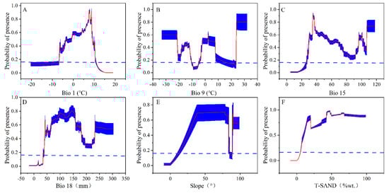 Response curves for the six most critical environmental variables. (A)–(F): Bio1, Bio9, Bio15, Bio18, Slope, T-SAND. The red curve and blue shading indicate the mean response and mean +/− one standard deviation for the 10 MaxEnt replicate runs. The blue dashed line indicates the maximum training sensitivity plus specificity threshold.