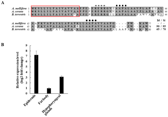 The amino acid sequence and tissue distribution of Apis mellifera apidermin 2 (AmAPD 2). (A) Alignment of the amino acid sequences of bee apidermin 2 (APD 2). The predicted signal sequences are boxed [4,13]. The conserved arginine-rich motifs and hydrophobic tetra peptides are shown by asterisks and solid circles, respectively [4]. The GenBank accession numbers of the aligned sequences are AmAPD 2 (NM_001085346), A. cerana APD 2 (XM_017050089), and B. terrestris APD 2 (XM_003394905). The identity/similarity (Id/Si) values were obtained using the AmAPD 2 sequence as a reference. (B) Expression of AmAPD 2 in the epidermis, fat body, and hypopharyngeal glands of A. mellifera worker bees, as assessed via quantitative reverse transcription-PCR (qRT-PCR) (n = 20).