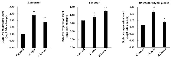 Transcription pattern of Apis mellifera apidermin 2 (AmAPD 2) in A. mellifera worker bees upon microbial ingestion. The transcription pattern of AmAPD 2 was analyzed in A. mellifera worker bees fed A. apis or P. larvae over 24 h. Untreated A. mellifera worker bees were used as controls. Total RNA was extracted from the epidermis, fat body, and hypopharyngeal glands of A. mellifera worker bees (n = 40). AmAPD 2 transcription was analyzed using quantitative reverse transcription-PCR (qRT-PCR). Data are represented as the mean ± standard deviation (SD) of three replicates (* p < 0.05 and ** p < 0.01).