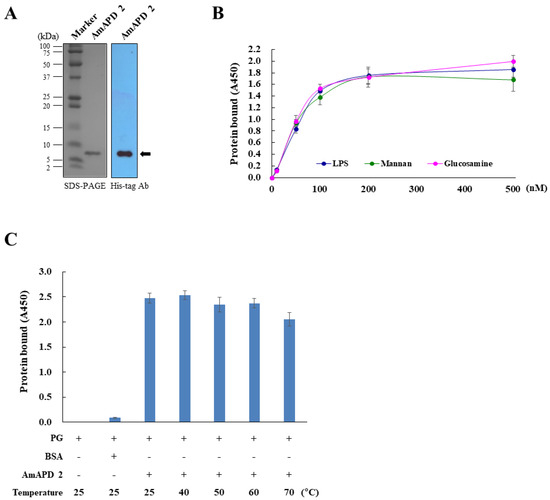 In addition, the thermal stability of recombinant AmAPD 2 was determined by binding heat-treated AmAPD 2 to PG. The result of the PG-binding assay revealed that recombinant AmAPD 2 was stable at heats ranging from 40 °C to 70 °C for 1 h (Figure 3C).