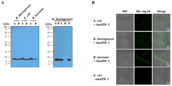 We performed a microbial binding assay using the recombinant AmAPD 2 against the live bacteria and fungi used in several of our previous studies [20,21,22,23]. The microbial binding assay using western blot analysis revealed that the recombinant AmAPD 2 binds to E. coli, B. thuringiensis, and B. bassiana (Figure 4A). We also found that recombinant AmAPD 2 heat treated at 50 °C for 1 h still bound to B. thuringiensis (Figure 4A). Moreover, we observed the localization of the recombinant AmAPD 2 on the microbial surfaces using immunofluorescent staining (Figure 4B).