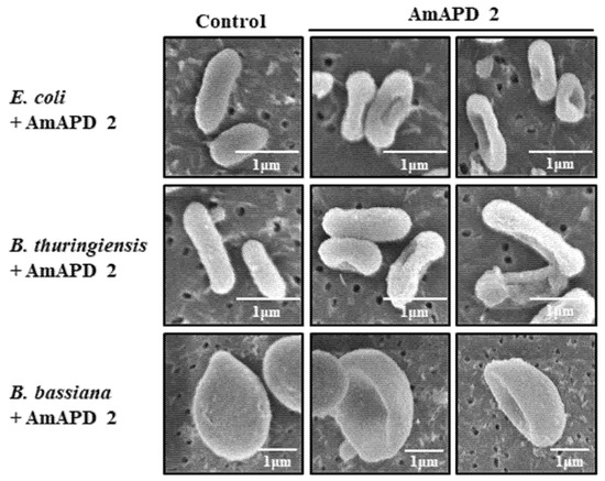 Scanning electron microscopy (SEM) observation of recombinant Apis mellifera apidermin 2 (AmAPD 2)-induced structural damage to microbial cell walls. The control column shows untreated E. coli, B. thuringiensis, or B. bassiana samples next to two AmAPD 2 columns showing treated microbial samples. Scale bars = 1 μm.