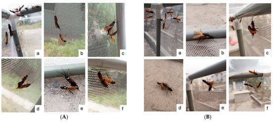 Searching: Males quickly gathered in the corner with direct sunlight after they were released, and females gradually gathered in the same corner soon after, allowing the males to find the females (Figure 1A(a); Figure 1B(a)).