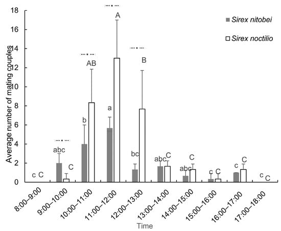 Mating circadian rhythms of two siricids. Different letters on the bars indicate significant differences (one-way ANOVA followed by Tukey’s multiple comparison test, p < 0.05). Significant differences between two siricids were analyzed by Mann–Whitney U-tests (p < 0.05; asterisked column, significant difference between two siricids).
