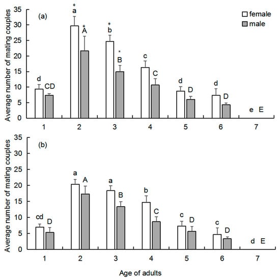 Two-day-old females and males showed the strongest mating behavior in both species. When the males were maintained at 2-days-old by daily replacement of older individuals, the cumulative number of mating couples with 2-day-old females was highest (29.67 ± 3.06), with a significant difference between 2-day-old males and other ages, in S. noctilio (p = 0.001, F = 84.877, df = 6) (Figure 3a) and S. nitobei (20.33 ± 1.53 mating couples, p = 0.000, F = 71.773, df = 6) (Figure 3b). Similarly, when the age of the females was fixed at 2 days old, the cumulative number of mating couples with 2-day-old males was the highest (21.67 ± 4.73), with a significant difference between 2-day-old females and other ages, in S. noctilio (p = 0.000, F = 33.904, df = 6) (Figure 3a) and S. nitobei (17.33 ± 2.51 mating couples, p = 0.000, F = 46.715, df = 6) (Figure 3a). Compared with S. nitobei, the average mating frequency of S. noctilio was much higher at each tested age.