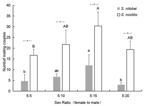 The female-to-male ratio of 5:15 was the most conducive to mating for both species. When the number of females was kept constant and the number of males was increased, a female-to-male ratio of 5:15 achieved the highest mating frequency in S. noctilio (30.3 ± 6.1) and S. nitobei (12.0 ± 4.8) (Figure 4), and further increasing the number of males decreased the mating frequency. Compared with S. nitobei, the average mating frequency of S. noctilio was much higher at each female-to-male ratio.