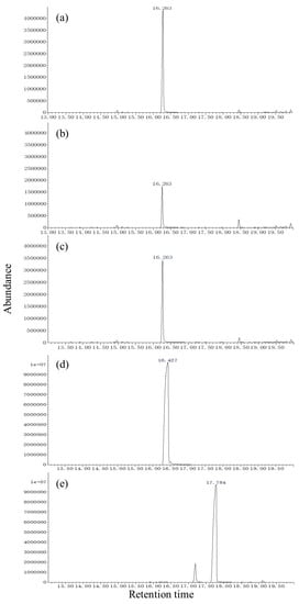 In the DB-WAX column (Figure 5), the mass spectrum of peak (a) from S. noctilio extract and peak (b) from S. nitobei extract exhibited the following peaks [m/z (relative abundance)]: 41, 55 (100, base), 68, 81, 95, 138, and 156. The mass spectrum had a molecular ion [M+] at m/z 156 and a significant [M+-18] ion at m/z 138 indicating loss of water, which was identical to that of peak (c) of synthetic standards (Z)-3-decen-1-ol. In addition, the retention times of peak (a) and (b) matched those of (Z)-3-decen-1-ol on the DB-WAX (20.396 min) (Figure 5a–c). Thus, the compound was identified as (Z)-3-decen-1-ol. Similarly, our results suggested that (Z)-3-decenol was also present in the SPME extracts of two populations. In HP-5 column (Figure 6a–c). However, two reported minor reference components, (Z)-4-decen-1-ol (Figure 5d and Figure 6d) and (E, E)-2,4-decadienal (Figure 5e and Figure 6e), were not identified in the SPME extract of either species on either type of column.