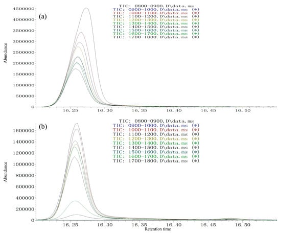 The SPME fibers were thermally desorbed into a splitless GC injector at 270 °C for 2 min. The GC/MS system consisted of an Agilent Technologies 5977A MS (Agilent, Santa Clara, CA, USA) coupled to an Agilent Technologies 7890 B GC (Agilent). For the HP-5 fused-silica column (30 m × 0.25 mm ID, 0.25 µm film, J&W Scientific Inc., Folsom, CA, USA), the initial oven temperature was maintained at 40 °C for 2 min, then increased at 6 °C/min to 180 °C, then increased at 15 °C/min to 270 °C. For the DB-WAX column (30 m × 0.25 mm ID, 0.25 µm film, J&W Scientific Inc., Folsom, CA, USA), the initial oven temperature was maintained at 50 °C for 1 min, then increased at 5 °C/min to 240 °C and maintained for 10 min. The NIST Mass Spectral Search Program (version 1.7) was used for data analysis. Injections were made in splitless mode. Helium was used as the carrier gas (1.0 mL/min). For electron impact (EI) mass spectra, the ionization voltage was 70 eV, the temperature of the ion source was 250 °C, and the temperature of the interface was 250 °C. Assignment of chemical structures to chromatographic peaks was based on comparison of their mass spectra fragmentation patterns and retention indexes with those of authentic standards. Circadian and age-dependent pheromone release was achieved by quantities expressed relative to the most abundant (Z)-3-decen-1-ol release period (set to a value of 100) during 11:00–12:00 in 2-day-old individuals for the two species.